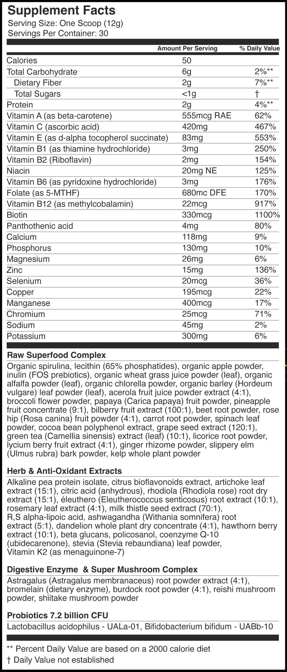 Superfood green powder is packed with powerful antioxidants from ingredients like acerola fruit juice powder extract, grape seed extract, and green tea extract, boosting your immune system and protecting your body from oxidative stress and damage.